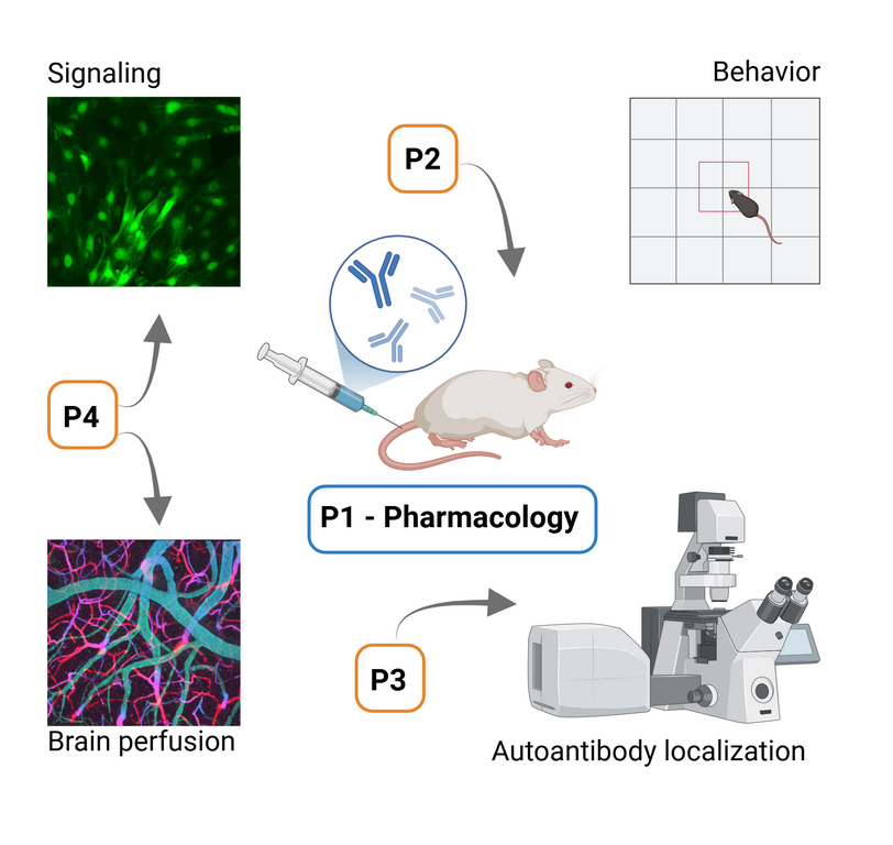 Project 1 aims to develop a mouse model of vascular pathologies of systemic autoimmune diseases, especially in the central nervous system. The project is conducted by the Institute of Experimental and Clinical Pharmacology and Toxicology and includes mechanistic studies in vitro and in mice to decipher the action of the AT1R-AAB on brain endothelial cells. Support from P2 is essential for the immunization of mice, support from P3 is necessary to identify target organs of the AT1R-AAB, and support from P4 is critical to optimize in vivo microscopy using a two-photon microscope in SAIL. The overall aim of P1 is to provide a small animal platform for future behavioral and neurovascular investigations of autoantibody-mediated diseases. Within this project, we will use highly sophisticated microscopy techniques (white light laser confocal microscopy; STED) which enables microscopy below the optical resolution and will be used to identify and describe antibody binding patterns. We will start with the brain vasculature but dependent on the findings of P3, we will examine other tissues of interest as well.
